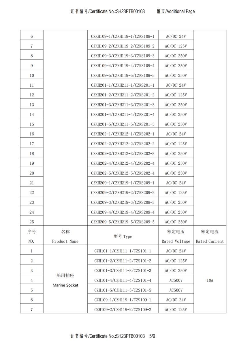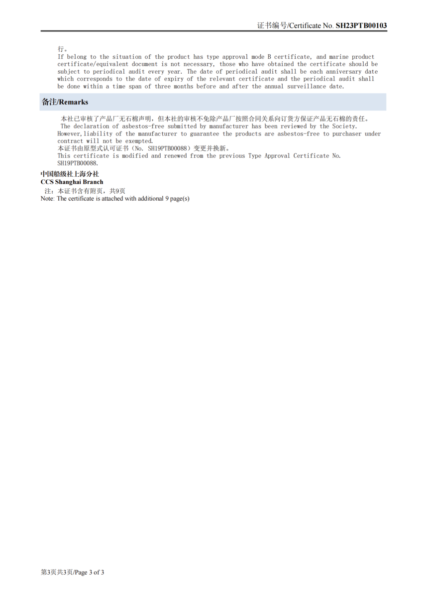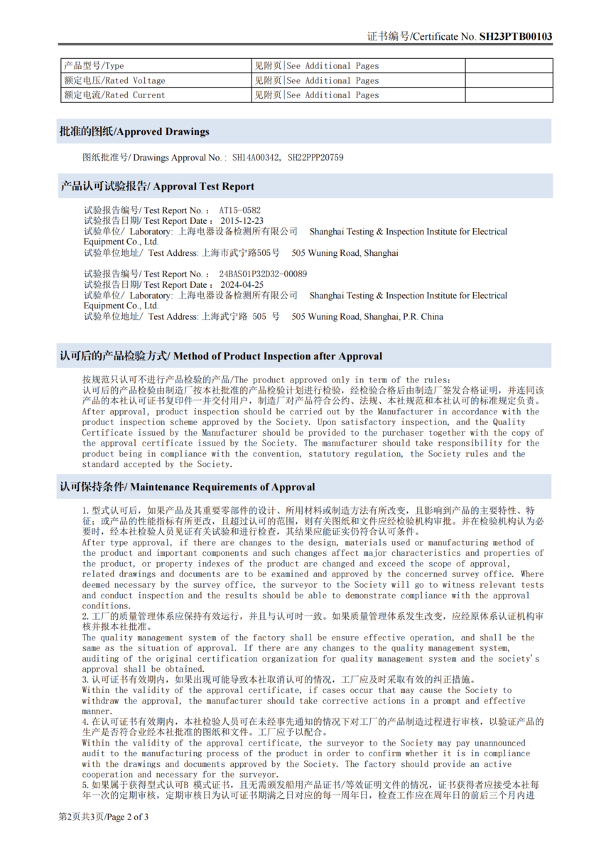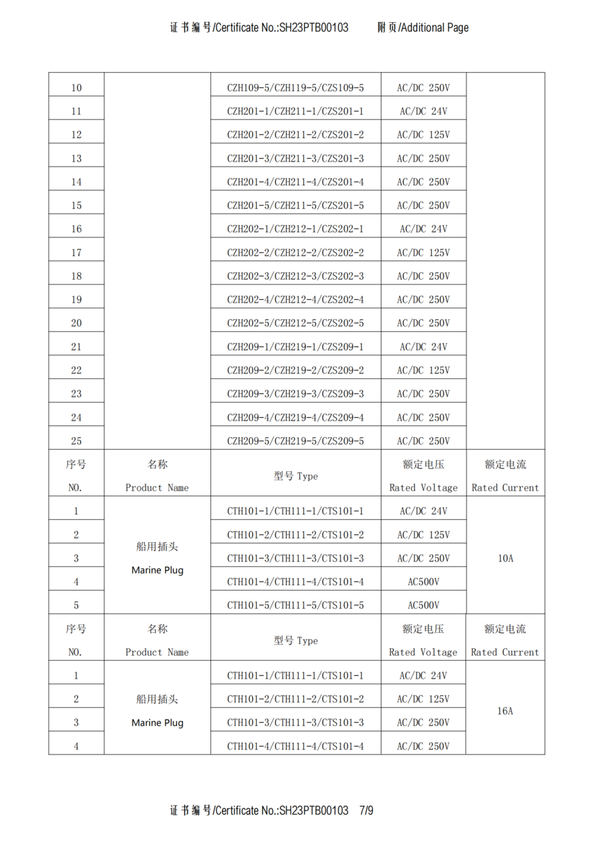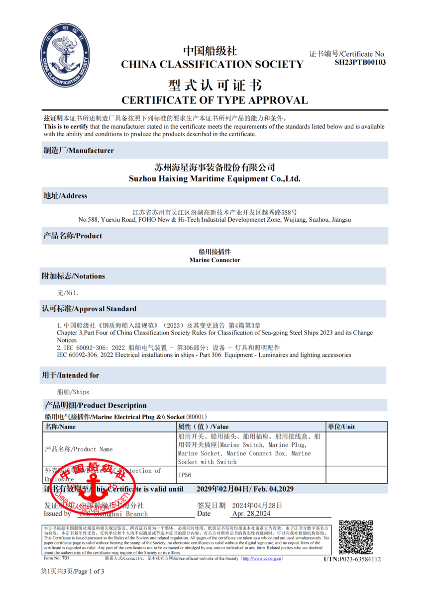 CCS船用接插件认可证书SH23PTB00103