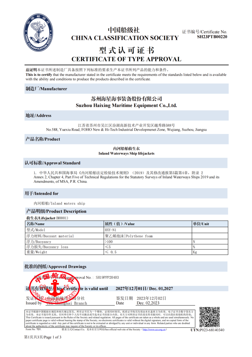 SH23PTB00220 HXY-N1 内河救生衣